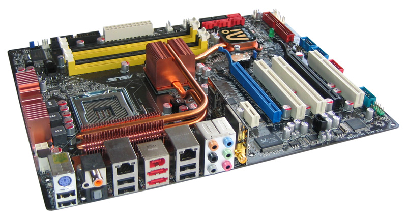 Seitens der Ausstattung hat die Platine erwartungsgemäß ebenfalls viel zu bieten. Neben den herkömmlichen Eckdaten gehören unter anderem zwei PCI Express x16 Ports mit zu den Spezifikationen. Als echte x16-Schnittstelle nach klassischer PEG-Anforderung ist jedoch nur einer der beiden ausgeführt, da der P35 nicht ausreichend PCI Express Lanes für vollwertiges CrossFire (SLI nicht offiziell unterstützt) bereithält (x4 elektrisch für den zweiten PEG). Des Weiteren finden wir auf der Rückseite noch zwei Anschlüsse für externe eSATA Storage-Devices, auch wenn uns hier ein passendes Slotbracket für den Stromanschluss der Laufwerke im Lieferumfang fehlt. Mit zu den High-Lights zählt natürlich die integrierte Funktionalität für drahtloses Netzwerk nach 802.11g (54 Mbit/sec) mit der Möglichkeit als Access-Point zu fungieren. Mit dabei ist außerdem auch eine IDE-Schnittstelle für herkömmliche optische Laufwerke und ältere Festplatten, die Asus mithilfe des JMB363-Controllers von JMicron wiederbelebt hat. Einen interessanten Schritt hat man beim Anschluss von Eingabegeräten gemacht: Es wurde der Anschluss für die PS/2-Maus gestrichen und stattdessen zwei zusätzliche USB-Ports an das Backpanel verlegt. Über Sinn und Nutzen lässt sich streiten.
