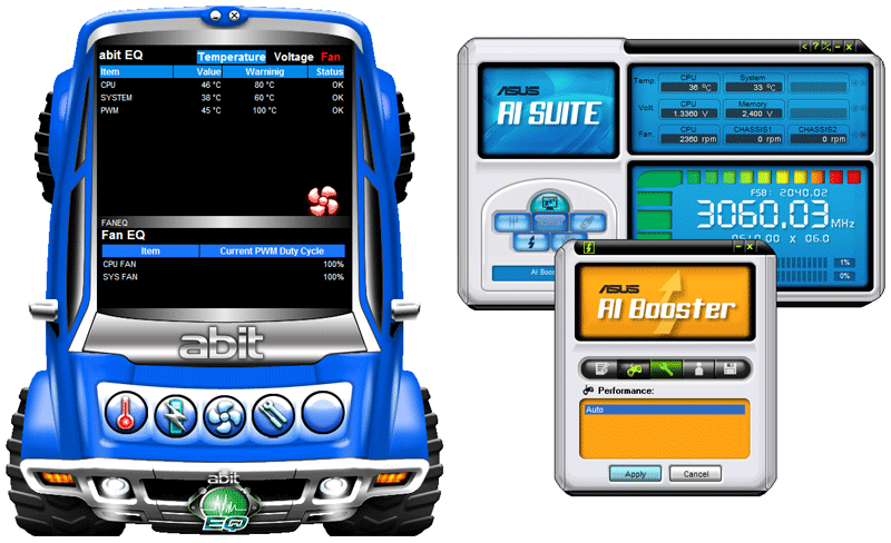 Wie heutzutage üblich, kommen beide Platinen mit diversen Tools zum Kunden. Auf Seiten von Abit wäre das Programm abitEQ zu erwähnen, was das Pendant zu PC Probe II von Asus ist. Nett ist auch die Asus Ai Suite, die dem P5K Premium beigelegt ist und unter anderem Overclocking unter Windows möglich macht.