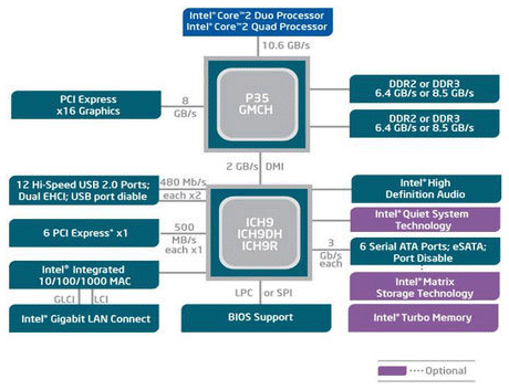 In der folgenden Tabelle finden Sie die technischen Daten aktueller Intel-Chipsätze auf einen Blick. Bei den Angaben zur Speicherunterstützung sei gesagt, dass es sich durchweg um den aktuellen Stand der Technik handelt. Zum Beispiel unterstützt Intels P35 DDR2 offiziell nur bis 800 MHz, doch ist eigentlich jedes BIOS in der Lage 1066 MHz zu realisieren. Gleiches gilt für die weiteren Intel-Probanden. Neben DDR3 ist auch Intel Turbo Memory erstmals beim P35 mit am Start. Weitere Features sind Intel Quiet System und der Support kommender 45 nm-Prozessoren.