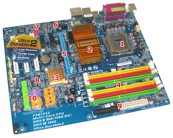 Im unteren Mainboardbereich befinden sich die Erweiterungsslots, die Southbridge, die Front-Panel-Anschlüsse, SATA2-Ports und der einzige IDE-Kanal, sowie Pins für die externen USB 2.0-Ports. Hier hat Gigabyte saubere Arbeit geleistet und unserer Meinung nach keine groben Fehler beim Layout der Platine begangen. Einzig die Position des CMOS-Reset könnte besser sein, da der dazugehörige Jumper bei Grafikkarten mit enormer Bauhöhe schwer zugänglich ist. Die Anordnung der PCI und PCI Express Steckplätze macht jedoch durchaus mehr Sinn: Selbst beim Einsatz von Dual-Slot-Karten stehen immer zwei PCIe x1 und drei PCI Schnittstellen zur Verfügung. Auf der folgenden Grafik haben wir nochmals alle wichtigen Stellen auf der Platine markiert und geben gleichzeitig eine kleine Übersicht zur Platzierung der einzelnen Chips und Funktionalitäten auf dem P35C-DS3R.