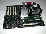 Als Spannungswandler kommt auf dem Boxed-Board ein 2-Phasenwandler zum Einsatz, um die Platine optimal mit Strom zu versorgen. Nebenbei sei erwähnt, dass der Poweranschluss an einer zwar eher ungewöhnlichen aber guten Position sitzt und nicht umständlich um den CPU Kühler geführt werden muss. Genau gleich verhält es sich mit den IDE- Anschlüssen und dem Floppy-Connector. Das Prädikat perfekte Lage würde hier am besten passen, da so eine optimale Erreichbarkeit gesichert ist...