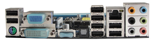 Am I/O-Shield des GA-H55-UD3H hat man einen PS/2-Anschluss, acht USB-Ports (alle 2.0), Audio-Ausgänge (Klinke und optisch) und den RJ45-Ethernet-Anschluss platziert. Außerdem stehen für die Grafik-Ausgabe der Clarkdale-Prozessoren (mit HD-Grafik) DVI-D, D-Sub und HDMI zur Verfügung. Alle weiteren Ports sind auch hier über separate Slot-Brackets oder Front-Panel-Elemente nutzbar. Entsprechende Brackets befinden sich nicht im Lieferumfang.