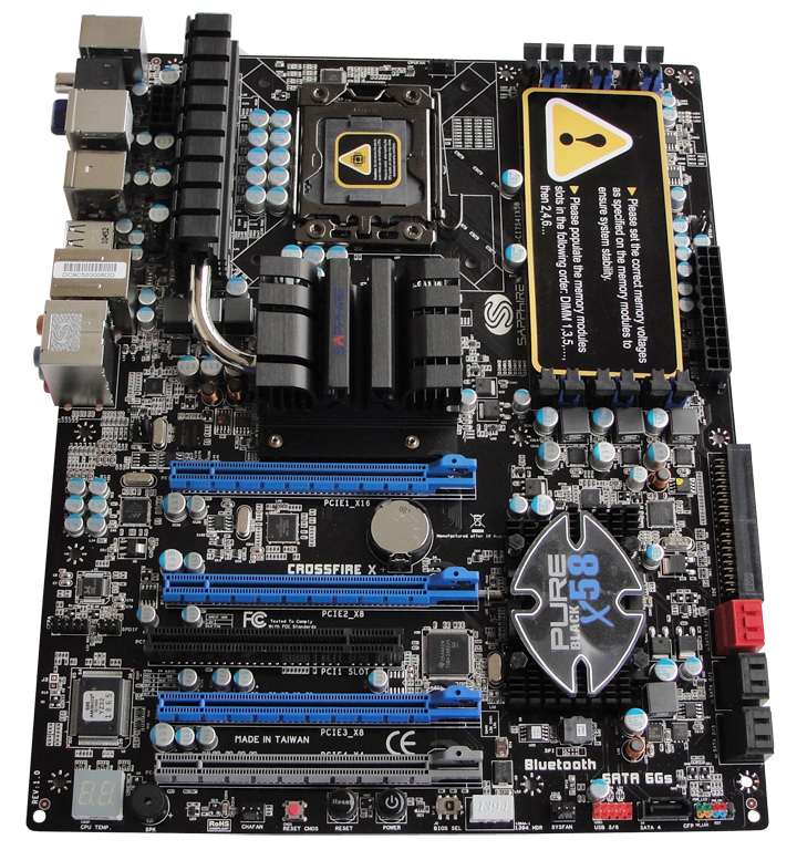 Das PURE Black X58 bietet in jedem Fall alle Voraussetzungen für Overclocking der verschiedenen Systemkomponenten. Eine hochstabile Stromversorgung gewährleisten die gleichen robusten Kondensatoren und patentierten Diamond Black Chokes mit Kühlern, die auch in einigen der Grafikkarten von Sapphire verbaut sind. Ebenfalls enthalten sind zusätzliche BIOS-Optionen zur Einstellungsoptimierung, eine Start-, Reset- und BIOS-Reset-Taste, eine Reihe von Signal- und Spannungstestpunkten sowie eine numerische LED-Statusanzeige. Eine integrierte Version von TriXX, dem hauseigenen Software-Übertaktungstool von Sapphire, ermöglicht dazu Performance-Tuning und Statusüberwachung.