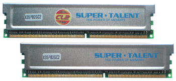 Hersteller Super Talent schickte uns kurz vor Redaktionsschluss noch ein 2 GB Testkit - das einzige in unserem Testfeld. Es handelt sich um PC3500 Speicher, ein Betrieb mit einer Taktfrequenz von etwa 220 MHz wird also durch den Hersteller garantiert. In unserem System liefen die beiden Module auch noch bei 250 MHz stabil bei Timings von 3-4-4-8 - gegen höhere Frequenzen streubten sich die Speicherriegel, auch eine Erhöhung der Versorgungsspannung schuf keine Abhilfe. Die Module sind derzeit in Deutschland nicht erhältlich, umgerechnet werden etwa 239 Euro fällig.