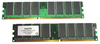Das takeMS DIMM-Kit siedelt sich mit etwa 74 Euro preislich im Bereich der MDT- bzw. Infineon-Riegel an. Leistungstechnisch gibt es so gut wie keine Unterschiede; die Module laufen stabil bei Timings von 2,5-3-3-5 bis zu einer HTT-Frequenz von 225 MHz, wohlgemerkt ebenfalls ohne zusätzliche Kühlung bzw. den Einsatz eines Heatspreaders. Darüber war allerdings Schluss, da sich die Riegel auch bei Timings mit höheren Latenzen oder durch höhere Spannungen nicht betreiben ließen. Dennoch eine weitere Alternative für den weniger anspruchsvollen Einsteiger.