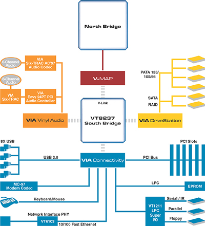 Die Southbridge wird wie gewohnt über über die altbekannte V-Link Technik (533 MB/sec) angebunden. Ganz wie