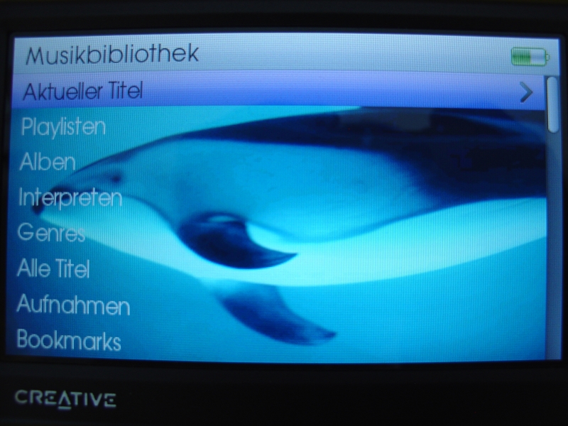 Beginnen wir nun als zweites mit dem Thema Musik. Die Menügruppe Musik ist gegliedert in Aktueller Titel, Playlisten, Alben, Interpreten, Generes, alle Titel, Aufnahmen, Bookmark und DJ. Auch im Bereich Musik kann die Wiedergabe mit den drei untersten Tasten ausnahmslos gesteuert werden. So stellt das Pausieren, das Abspielen und Vor- und Zurückspulen kein Problem dar. Beim Abspielen eines Titels ist es möglich die Position zu wählen, einen Bookmark zu setzen, die Details anzeigen zu lassen, einen Interpret zu suchen, den Titel zu entfernen, als Playlist zu speichern, den Wiedergabemodus einzustellen und den Titel zu kaufen. Während der Wiedergabe von Musik ist der Vision W Multitasking fähig, somit ist die Möglichkeit gegeben sich Fotos und Kalendereinträge während der Musikwiedergabe anzusehen. Der eingebaute Lautsprecher übersteuert jedoch bei hoher Lautstärke sehr schnell. Über die mitgelieferten symmetrischen Stereokopfhörer von Creative hingegen überzeugt der Klang und die Lautstärke. Bei einer optimalen Einstellung mit dem Bass-Boost und Equalizer brilliert der Player im Klang auf ganzer Linie.