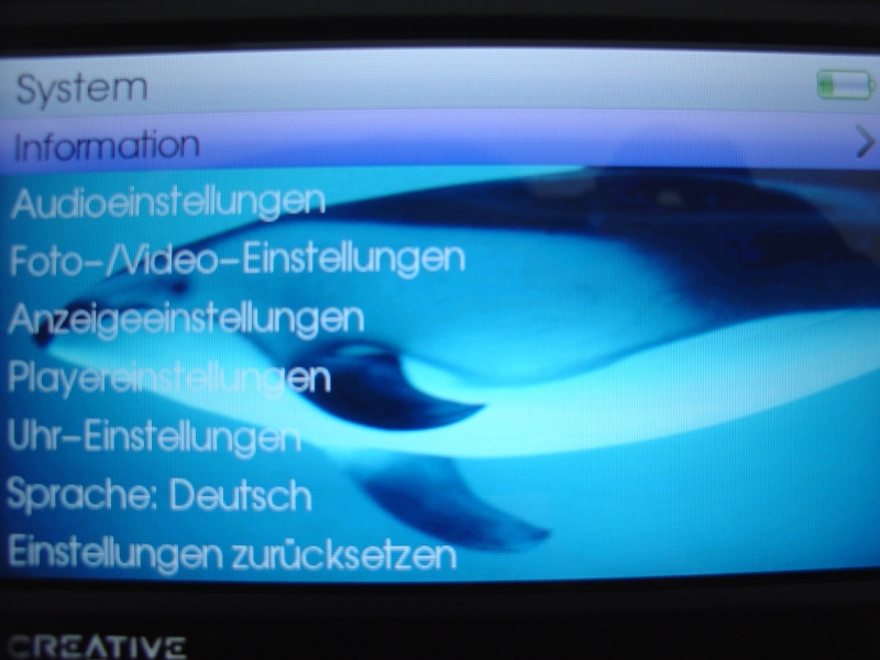 Mit dem Logo von Creative wird man beim Einschalten des Geräts kurz begrüßt. Es stehen sofort die Anwendungen Musikbibliothek, Fotos, Videos, FM-Radio, Aufnahme, Extras, System und Compact-Flash Karte zur Verfügung. Am rechten oberen Displayrand wird die Stärke des Akkus angezeigt, der Akku ist zudem austauschbar und kann durch einen Zweitakku ersetzt werden, um eine noch höhere Bereitschaft des Multimedia Players zu erreichen. Die Menüpunkte können, wie oben schon beschrieben, je nach Nutzer eingestellt und individuell angepasst werden. In der Menügruppe Extras kann der Nutzer das Datum und die Uhrzeit einstellen, das Wechselspeichermedium verwalten und den Organizer einrichten. Im Organizer kann man den Kalender, seine Aufgaben und die Kontakte betrachten, die man zuvor mit Microsofts Outlook vom heimischen PC synchronisiert hat.