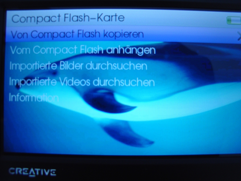 Als letzte der drei Multimediaanwendungen kommen wir nun zu den Fotos. Natürlich ist der Creative Zen Vision W auch geeignet um Fotos zu betrachten, so können beispielsweise durch den Compact-Flash Slot sofort Bilder angesehen und auf den Player transferiert werden. Man kann das betrachtende Bild drehen, vergrößern, bewerten, löschen, als Hintergrund einrichten, eine Diashow starten sowie die Details einsehen. Die Bilder weißen eine ausgezeichnete Schärfe auf und sind sehr detailreich. Um die Fotos auszuwählen werden 40 Miniaturbilder angezeigt, die durch anklicken vergrößert werden. Da der Portable Multimedia Player nur Bilder in dem Format JPEG verarbeiten kann, müssen Bilder gegebenenfalls vorher mit der beigelegten Software angepasst und ins richtige Format gebracht werden.