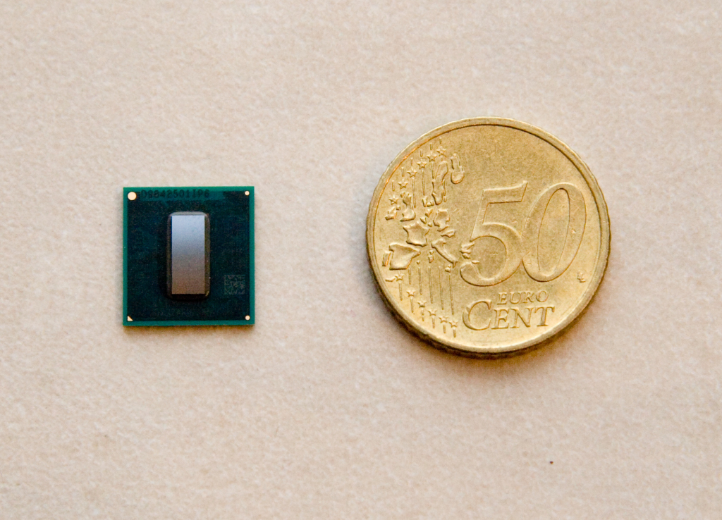 Ebenso wie die großen Brüder aus der Desktopabteilung verfügt der, unter dem Codenamen Silverthorne entwickelte Atom über die Stromsparmechanismen Enhanced Speed Step und Deep Power Down (C6), mit deren Hilfe große Teile der CPU schlafen gelegt werden können. Als Resultat zeigt sich der Atom mit einer TDP (Thermal Design Power) von 0,6 bis 2,4 Watt je nach Frequenz des jeweiligen Modells und einem laut Intel durchschnittlichen Stromverbrauch von 220 mW, was sich in Anbetracht der hohen Frequenzen von 800 MHz bis 1,86 GHz - je nach Modell - durchaus sehen lassen kann. Ein wichtiger Punkt, wenn man bedenkt, dass die 47 Millionen Transistoren ihre Wärme nur über eine DIE Größe von lediglich 25 mm² abgeben können. Dies entspricht einem Platzbedarf, der unter dem einer Euro-Cent Münze liegt (siehe Bild oben). Um ein Maximum an Leistung und Effizienz aus der 16-stufigen Pipeline des Prozessors zu holen, verfügt der Atom zudem über die Fähigkeit zum Hyper-Threading. Für die Praxis bedeutet dies, dass Silverthorne eine mehrfädige-Architektur nutzt und damit in der Lage ist, schnelle Kontextwechsel zwischen verschiedenen Threads durchzuführen. Damit soll bei gleichen technischen Eckdaten (Frequenz, Cache etc.) und moderatem Hardwareaufwand die Bearbeitungseffizienz der CPU steigen (Threads nutzen gegenseitig Wartezyklen aus). Zu den weiteren Features gehören Intels Virtualisierungs-Technologie und SSE3.