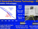 Um die Transistoren und somit den gesamten Prozessor schneller arbeiten zu lassen, wird zudem ein neues Fertigungs- und Aufbereitungsverfahren für das verwendete Silizium benutzt. Hierbei nennt Intel das Schlagwort Strained Silizium, wohinter sich eine komplizierte Technik verbirgt, mit der das natürliche Kristalgitter des Siliziums aufgebogen wird um einen besseren und vorallem schnelleren Eletronenfluss zu erreichen. Die Folge sind Tranistoren mit kürzeren Schaltzeiten.