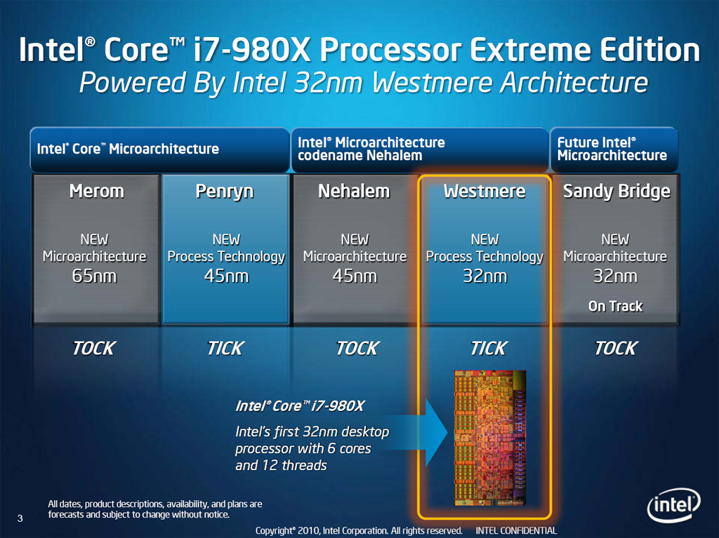 Wie bereits im Vorwort erwähnt, hat Intel im November 2008 mit Nehalem eine neue Mikroarchitektur eingeführt. Einige Monate nach dem offiziellen Stapellauf von Nehalem, verpasst man der Technik eine Frischzellenkur und führt einen 32 nm DIE-Shrink durch. Die Westmere-Architektur ist dadurch deutlich platzsparender und auch bezüglich der Leistungsaufnahme ergeben sich neue Möglichkeiten für Chipgigant Intel. Entsprechend stellt man mit Gulftown den ersten 32 nm Prozessor mit sechs physikalischen Kernen vor. Dank Hyper-Threading-Technologie ist der auf 1,17 Milliarden Transistoren basierende Mikroprozessor in der Lage bis zu 12 Threads parallel zu bearbeiten und katapultiert SMT (Simultaneous Multi-Threading) im Desktop-Bereich in eine neue Dimension.