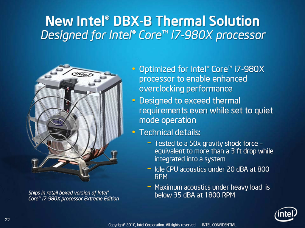 Mit der Einführung des Core i7-980X Extreme Edition bringt man nicht nur den ersten Six-Core Prozessor auf den Markt, sondern auch einen neuen Boxed-Kühler auf Heatpipe-Basis. Der Intel DBX-B genannte Kühler soll sowohl einen angenehm leisen Betrieb im Idle als auch Overclocking des 980X ermöglichen. Laut Hersteller Intel liegt die Geräuschentwicklung im Idle bei etwa 20 dB(A) bei einer Umdrehungsgeschwindigkeit von 800 UPM. Unter Belastung steigt der Schalldruck auf 35 dB(A) an, wobei der Lüfter bei 1800 UPM rotiert.