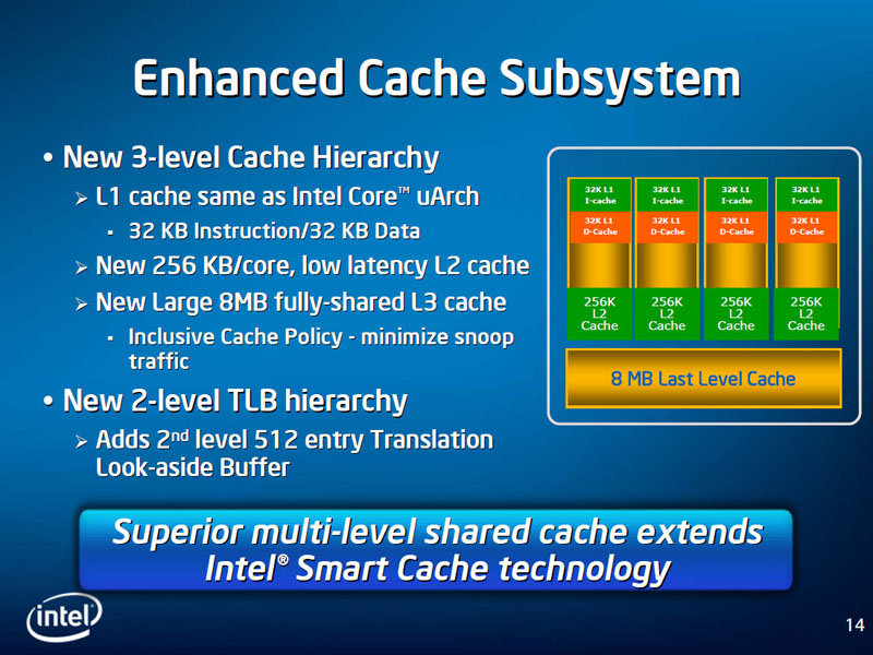 Neu ist auch der Einsatz eines Triple-Channel-Interfaces, welches drei Arbeitsspeicherriegel gleichzeitig anbindet und so eine noch größere Bandbreite erreicht. Außerdem wurde der Level 3-Cache wiedererweckt, nachdem er in Desktop-Prozessoren zuletzt bei den Pentium 4 Extreme Edition Modellen verbaut wurde. Jedem Kern steht somit ein Level 1- und Level 2-Cache zur Verfügung und miteinander sind sie über einen großzügigen Level 3-Cache verbunden.
