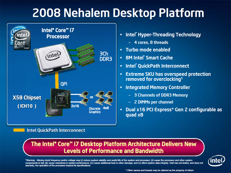 Im Vergleich zum Core 2 Quad hat sich beim i7 Codename "Nehalem" viel getan. Eigentlich ist nichts mehr so wie es bisher war, da der i7 Intels erster echter Quad-Core Prozessor ist. Alle bisher als Quad-Core gepriesenen Prozessoren bestanden grundsätzlich aus zwei bekannten Core 2 Duo Kernen. Der Speichercontroller ist, nun auch bei Intel, nach Innen gewandert und der Front Side Bus (FSB) wurde bei der Gelegenheit eingestampft. Die neue Technologie nennt sich Intel QuickPath Interconnect (QPI) und ist genau genommen eine serielle Punkt-zu-Punkt Verbindung. Der QPI stellt bidirektional bis zu 6,4 GT/sec zur Verfügung und damit bis zu satte 25,6 GB/sec Speicherbandbreite, was einer glatten Verdopplung gegenüber des alten FSB-Technik mit 1333 MHz entspricht. Bei Multi-Core-Prozessoren mit mehr als vier Kernen setzt Intel sinnvollerweise auf mehrere QPI-Links. Der integrierte Speichercontroller ist offiziell zertifiziert für DDR3-800 und DDR3-1066. Schnellere Speicher sind grundsätzlich möglich, können aber Probleme verursachen, vor allem bei Spannungen über 1,7 Volt. Mehr zum Overclocking der Core i7-Prozessoren lesen Sie ab Seite 9 des Artikels.