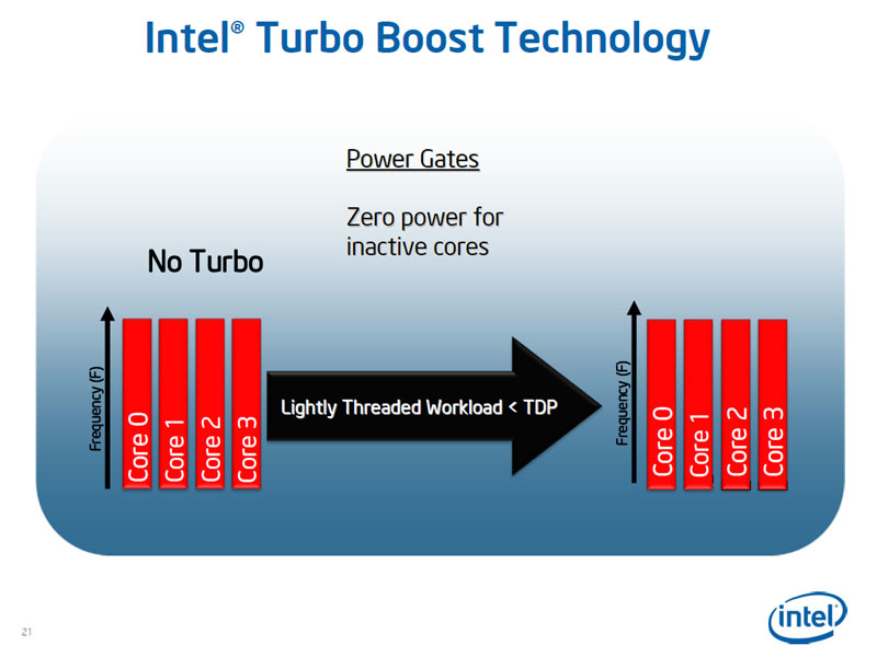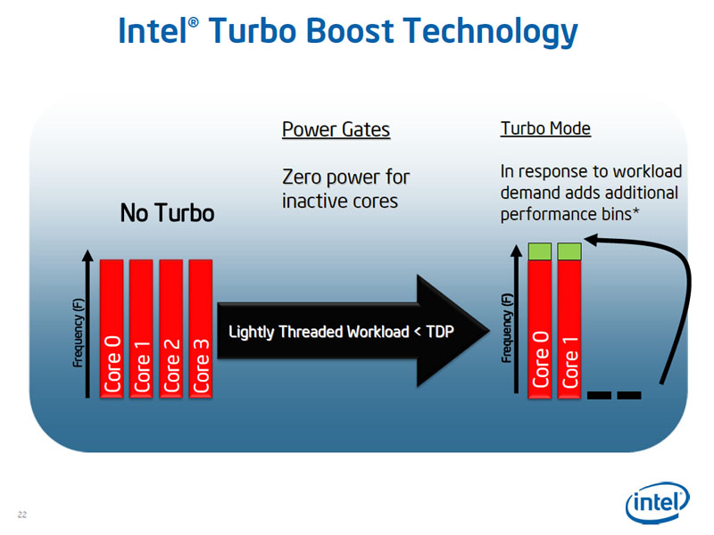 Der Turbo Modus ist eine Errungenschaft der i7-Familie. Hierbei handelt es sich um eine lastbedingte Multiplikatorerhöhung: Nutzt eine Anwendung nur einen Kern diesen aber unter voller Last so kann der Turbomodus diesen Kern übertakten, soweit es die CPU-Spezifikationen zulassen. Das heißt, die TDP darf nicht überschritten werden und die Temperatur muss im Rahmen bleiben, so dass der Prozessor keine bleibenden Schäden nimmt.