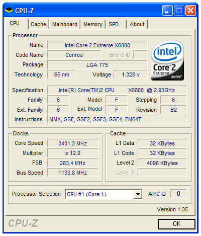 Wir fakelten nicht lange und starteten unser Betriebssystem mit einem Multiplikator von 12, was eine Kernfrequenz von 3,20 GHz bedeutete und problemlos und stabil betrieben werden konnte. Das Erhöhen auf FID = 13 führte hingegen zu einem Systemabsturz beim Booten von Windows XP x64 und zwang uns somit mehr Spannung (VID) zur Verfügung zu stellen: Einwandfreier Betrieb bei 3,46 GHz (13 x 266) und einer Spannung von 1,375 Volt. Unser X6800 belohnte die Aktion mit einem Score von 1129 CB-Punkten.