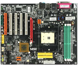 Kommen wir nun zu den neuen Athlon 64 und Athlon 64 FX Plattformen bzw. zu den Sockeln für 754- und 939-Pin Prozessoren. Prinzipiell hat man hier die Qual der Wahl, da man sich grundlegend auch zwischen AGP und PCI Express entscheiden muss. Jedoch wollen wir das Thema PCI Express hier nicht behandeln, da entsprechende Platinen auf nForce 4 Basis noch nicht verfügbar sind und auch nicht alle Board-Partner ihre Platinen offiziell vorgestellt haben. Kommen wir also zum Sockel 754 auf AGP-Basis: Als absoluter Ausstattungskracher erweist sich ganz klar das MSI K8N Neo Platinum Edition 54G. Das MSI Board basiert auf Nvidias nForce 3 250Gb Chipsatz, welcher unter anderem auch über eine integrierte Firewall verfügt. Ausgestattet ist das ATX-Mainboard mit vier Serial-ATA Kanälen, die als RAID 0, 1 und 0+1 genutzt werden können. Darüber hinaus verfügt das MSI K8N Neo über eine Gigabit Netzwerkkare, einem Firewire Anschluß und sechs USB 2.0 Schnittstellen, sowie FireWire. Als kleinen Leckerbissen hat MSI einen WLAN-Adapter nach 802.11g Standard (54 MBit/sec) in den Lieferumfang mit reingepackt. Preislich liegt das Board (Bild unten links) bei etwa 110 Euro.