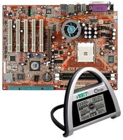 Als weitere Platinen wollen wir das Abit KV8 Pro 3rd-Eye auf Basis des VIA K8T800 präsentieren, welches mit einem sehr nützlichen Extra daherkommt: µGuru Clock. Die Abit µGuru Clock ist ein externes Gerät, welches in ersten Augenblick ein wenig an einen Wecker oder digitalen Thermometer erinnert. Prinzipiell arbeitet das Gerät auch ähnlich und gibt dem User Aufschluss über Temperaturen, Drehzahlen und vielem mehr. Des weiteren verfügt die KV8 Pro Platinen ansich über zwei Serial-ATA Anschlüsse, welche als RAID Level 0 oder 1 genutzt werden können. Ein 6-Kanal Audio Codec verwöhnt die Ohren bei Spielen und Filmen und in lokalen Netzwerken werden über die GbE satte Bandbreiten erreicht. Ein durchweg interessantes Board für kleines Geld.