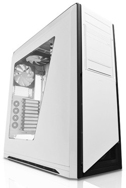 Dem Unterschied zwischen Big-Tower und Midi-Tower entsprechend, ist das Phantom 410 etwas kleiner und nimmt Platinen in den weit verbreiteten Formaten ATX, Micro-ATX und Mini-ITX in seinen schwarz lackierten Innenraum auf. Mit 21,5 cm Breite, 52 cm Höhe und 53,2 cm Tiefe ist es rund einen Zentimeter schmaler, zwei flacher sowie neun Zentimeter kürzer als das Big-Tower-Pendant. So verbergen sich beim 410 hinter der nach links öffnenden Tür in der Front nur drei Slots für 5,25-Zoll-Laufwerke (beim Phantom sind es fünf), was vielen Nutzern völlig genügen dürfte. Außerdem können sechs Laufwerke im 2,5- oder 3,5-Zoll-Format untergebracht werden, wobei letztere werkzeuglos durch je vier Pins befestigt werden können.