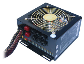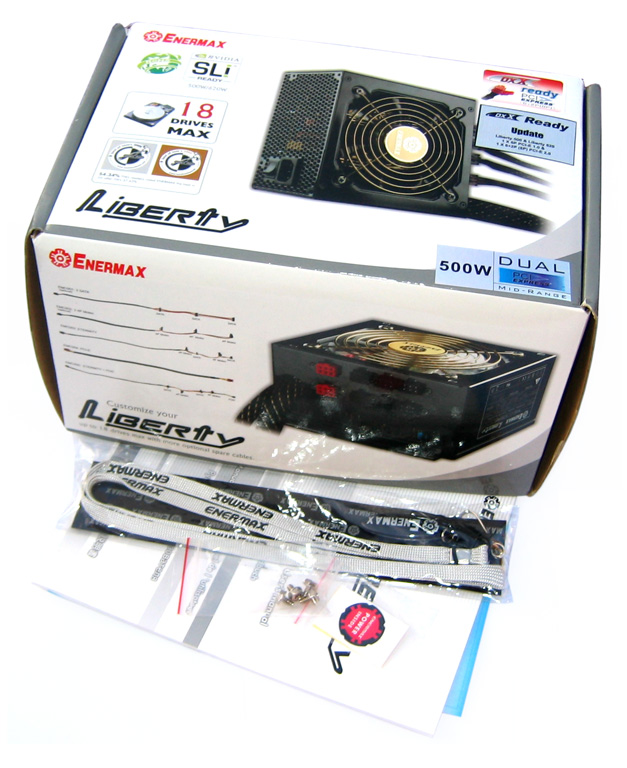 Beim Liberty ELT500AWT von Hersteller Enermax handelt es sich um ein Standard ATX-Netzteil mit aktiver PFC (Faktor 0,99). Offiziell gibt Enermax für Belastungen zwischen 30 und 100 Prozent der maximalen Ausgangsleistung eine Energie-Effizienz von etwa 80 Prozent an. Daher darf sich das Netzteil über 80 PLUS-Zertifizierung freuen. Auf eine entsprechende Kennzeichnung auf der Verpackung und dem Netzteil hat man (bislang) zwar verzichtet, in der offiziellen 80 Plus-Kompatibilitätsliste (Stand: 01/2008) ist es jedoch aufgeführt. Die Effizienz werden wir ab Seite 5 versuchen zu bestätigen und in den verschiedenen Belastungsstufen (20, 50 und 100 Prozent) zu messen. Ebenso werden wir im Verlauf des Artikels auf die integrierte Lüftersteuerung des ELT500AWT eingehen. Generell haben die Entwickler bei Enermax einen 120 mm-Lüfter verbaut, der durch die großen Abmessungen möglichst ruhig im Betrieb sein und gleichzeitig gut kühlen soll. Auf diese und weitere Details kommen wir im späteren Verlauf des Artikels. Werfen wir einen Blick auf die maximalen Ausgangsleistungen wie auf dem Typenschild angegeben. Die Combined-Power für +3,3 V und +5 V beträgt 160 Watt, für die beiden +12 V-Rails insgesamt 32 A bzw. 384 Watt Combined. Damit ergibt sich eine Combined-Power von exakt 477,8 Watt für die drei wesentlichen Versorgungsleitungen (+3,3 V, +5 V, +12 V) des Enermax-Netzteils (22,2 Watt Combined für -12 V und +5 Vsb).