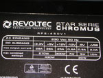 Die Revoltec Star Serie Chromus ist, wie der Name schon sagt, ein in Chromfarben glänzendes Netzteil. Die Verpackung hingegen ist in schlichtem Dunkelblau und wirkt Kühl, aber durch das angewandte Design irgendwie interessant. Im Lieferumfang des Netzteils befinden sich ein Stromkabel, vier Schrauben und eine Kurzanleitung in verschiedenen Sprachen – auch in Deutsch. Auffällig ist der 120 mm große Lüfter, der dank seiner doppelt verbauten Kugellager für höchste Laufruhe sorgen soll.