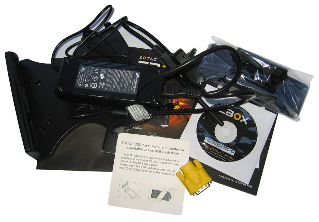 Öffnen wir die Verpackung des neuen ZOTAC Mini-PCs, finden wir eine ganze Reihe von Zubehör vor. Neben einem externen Netzteil für die Versorgung des Geräts, legt das Unternehmen einen DVI/HDMI-Adapter und eine kurze WiFi-Antenne zum Anschrauben an das Gehäuse bei. Dank eines herkömmlichen Standfußes für die aufrechte Inbetriebnahme der ZBOX, sowie einer VESA-Halterung für die Monitor-Rückseite, hat der Kunde freie Wahl bei der Installation seiner neuen Errungenschaft. Außerdem legt man noch einen Quick Installation Guide, ein Handbuch sowie Informationen zur Garantie bei. Auf einer DVD liefert man alle benötigten Treiber und Tools für die Einrichtung der EI750. Wer kein optisches Laufwerk an die ZBOX anschließen möchte, wird sich über den mitgelieferten USB-Stick freuen: Beim Einstecken des Winzlings meldet sich dieser als optisches Laufwerk und kann wie eine herkömmliche DVD verwendet werden. Damit steht der Inbetriebnahme nichts mehr im Wege! Folgend der gesamte Lieferumfang unseres Testprobanden im Überblick:
