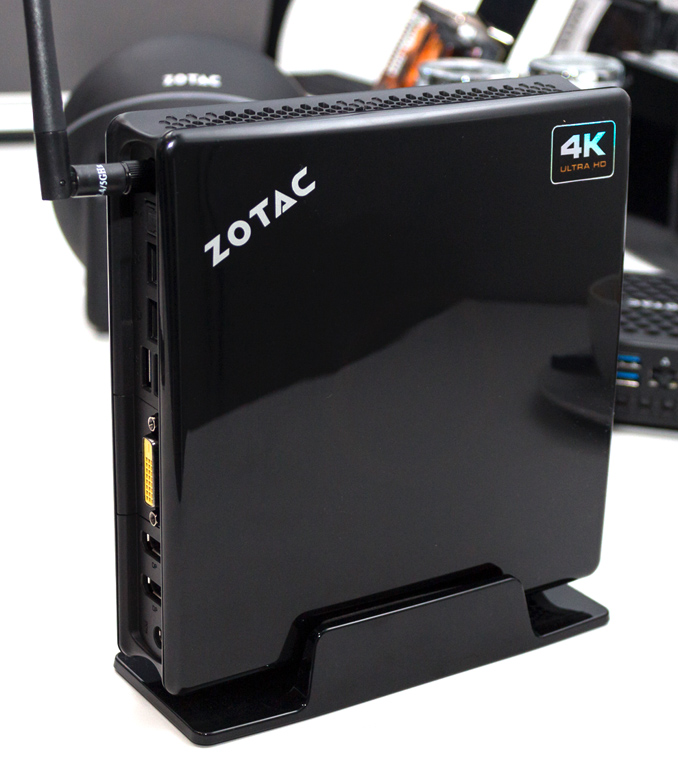Seitens der externen Schnittstellen hat der Winzling auch einiges anzubieten. Auf der Rückseite des schlanken Gehäuses finden wir einen S/PDIF-Ausgang für optische Audioübertragung, Dual-Gigabit-Ethernet, zwei USB 3.0 Ports, DVI-D sowie zwei DisplayPort-Anschlüsse. Ebenso wird das externe Netzteil auf der Rückseite eingesteckt. Auf der Oberseite hat man unter einer kleinen Gummikappe einen weiteren USB 3.0 Port versteckt, der beispielsweise für das unkomplizierte Einstecken von USB-Speichern verwendet werden kann. An der Vorderseite findet man einen Infrarot-Sensor, zwei 3,5 mm Klinken-Buchsen (Kopfhörer und Mikrofon), einen 4-in-1 Kartenleser (MMC/SD/SDHC/SDXC) sowie einen weiteren USB 3.0 Port – USB 2.0 ist bei der neusten ZBOX von ZOTAC kein Thema mehr. Ergänzt wird die Front durch zwei Aktivitäts-LEDs. Drahtlose Schnittstellen sind mit WLAN gemäß 802.11a/b/g/n/ac Standard sowie Bluetooth 4.0 ebenso vorhanden und jeweils auf aktuellem Stand der Technik.